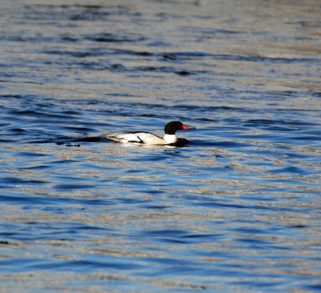 Zaza and I packed up tea and Christmas goodies and headed out for a 3 hour foray. We wandered through the side streets of Carleton Place looking for the Coopers Hawk in town to no avail so we headed down Cavanagh to Appleton Side Road. A small flock of 10 Snow Buntings were on the road near the intersection which seems to be a locale where I often see them. We headed north to farm fields on the east side of Appleton Side Road north of Hamilton Side Road. This is the western edge of the Ottawa Valley and after this the large open fields drop off dramatically. I had one Snowy here both on Dec 30 and 31st but today nothing. We circled the area 3 times with no luck. So onto to Almonte, where we enjoyed a Raven gliding effortlessly with its large wedge tail. We headed for the open water near the Barley Mow where we found one Common Merganser. A local stopped to ask if it was a duck and said “Now – Will it be alright out there!” I assured her it would.