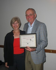 In the photo below Al Potvin of Almonte receives a Champion for Nature Award from Joyce Clinton, President of the Mississippi Valley Field Naturalists, at MVFN’s 2012 Spring Gathering banquet.