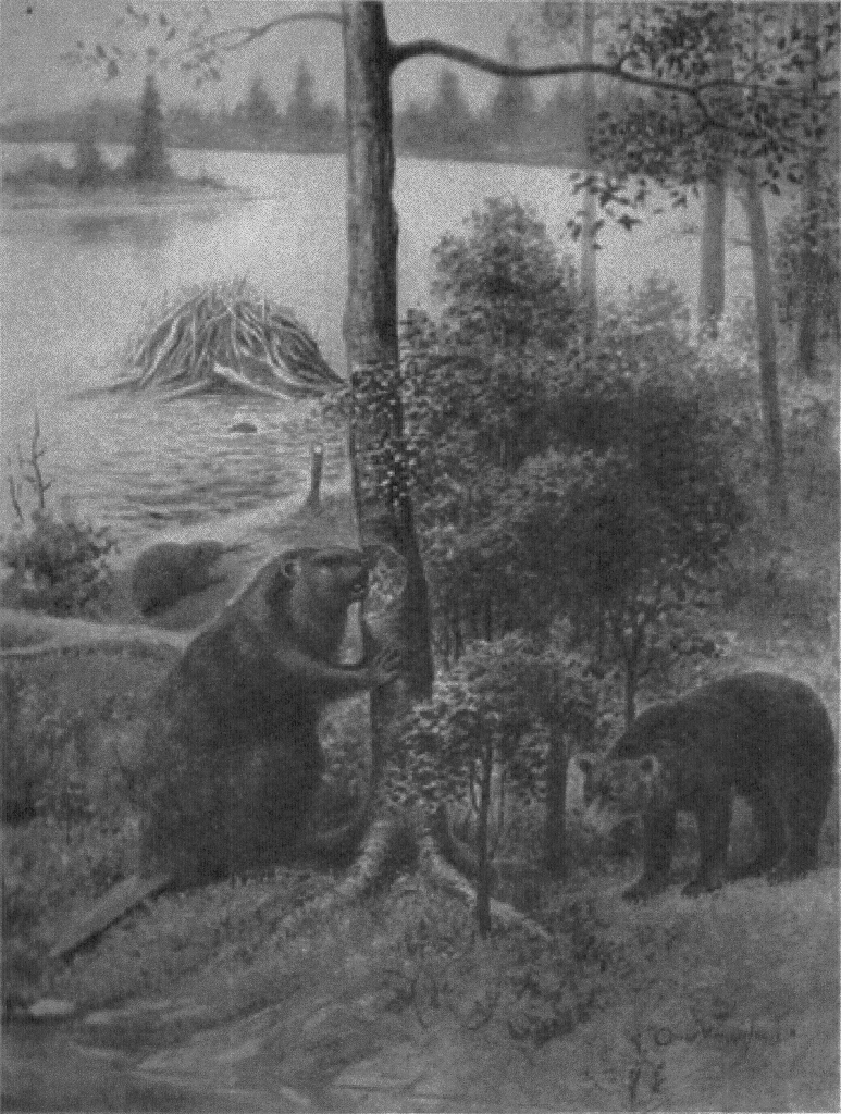The next feature to consider is wood cutting. Once one knows how a beaver’s teeth cut wood, one can predict which of beavers ancestors had teeth that might work the same way. So, Dr. Rybczynski went undercover with some zoo beavers and made a movie of them cutting wood. They use their lower teeth only, and, turning their heads, they use only one lower tooth at a time! The cutting produces a characteristic gnawing pattern on two pieces of wood, an ‘A’ and a ‘B’ piece. Castor uses about 60% of the cutting edge of its incisor for cutting. At the Ellesmere Island site fossil evidence of beaver ancestor Dipoides was discovered with what could be wood-cutting teeth, although it likely used only 45% of its incisor surface. It was exciting to learn that there was fossilized Dipoides-cut wood to match. No fossil cut wood has yet been found to match the dentition of the mighty Castoroides ohioensis (shown in this early painting by O.M. Highley). When asked about the likelihood of it ever being found, Dr. Rybczynski says, yes, she thinks it will eventually be found.
