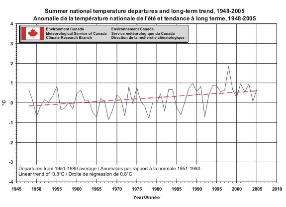 Not so long ago we spoke of climate change in the context of geological time scales i.e. thousands of years. However, today it is apparent that climate is changing in Canada and around the world, at rates that are detectable within decades. A graph of national long-term temperature averages since 1948 is shown at the bottom of this page.