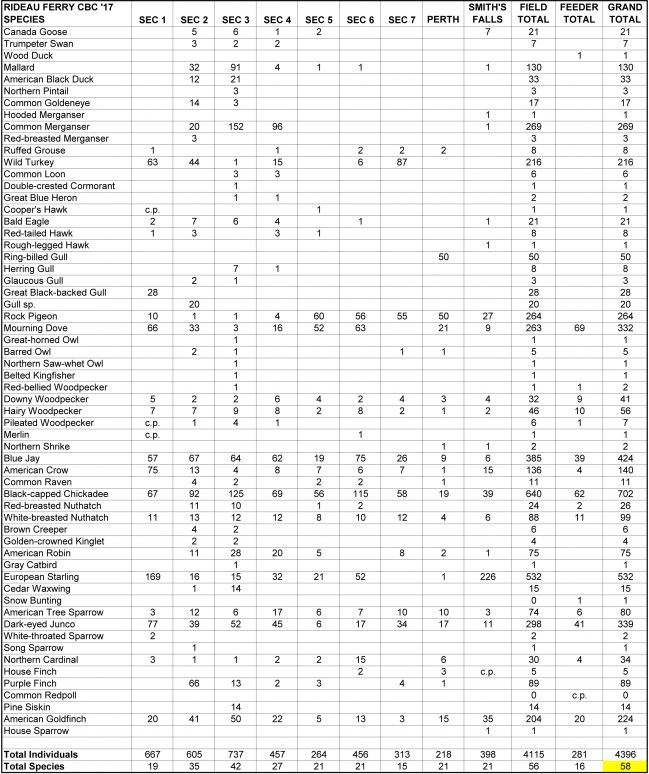 The chart below the photos, summarizes results of the 4396 birds counted and was prepared by count compiler Alison Bentley. Or click here for a pdf of these 2017 Rideau Ferry Christmas Bird Count results.