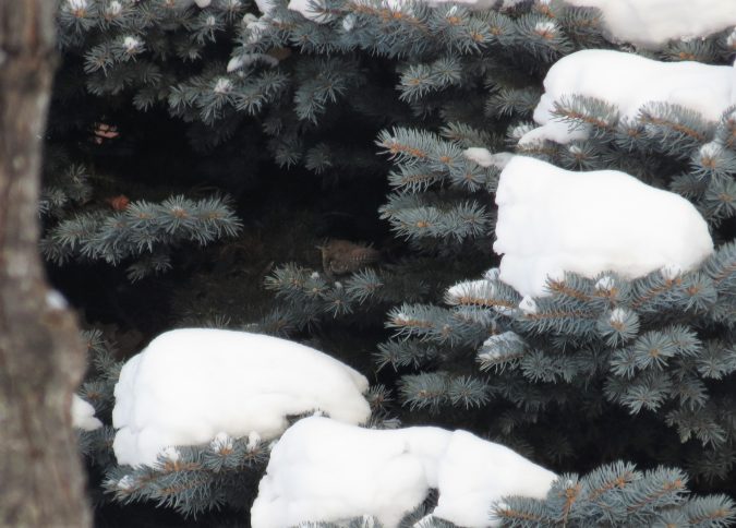 Winter wren hiding in blue spruce on count day. photo H. Robinson