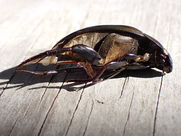 As a group, we tallied 50 species including nine different types of warblers. Most of the warblers remained “heard only” birds, however. A cooperative Barred Owl sat still in a tree near the house until after all the participants had a chance to view it at their leisure. Other highlights included good looks at Baltimore Oriole, Scarlet Tanager and Rose-breasted Grosbeak, all of which were singing constantly. A “flock” of four Great Blue Herons flying over the beaver pond was an unusual sighting. Two Spotted Sandpipers flew in and perched on a stub in the pond, too. A family of Canada Geese with dad and mom escorting 6 downy goslings did a sail past on the pond. A Trumpeter Swan that flew right over us at the pond was a life bird for at least one person. An interesting non-bird find was a very large dead water scavenger beetle on the path near the beaver pond. It was well over an inch long.